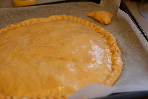 Bake in the middle of pre-heated 200 C oven for about 30 minutes, until the empanada is lovely golden brown on top.